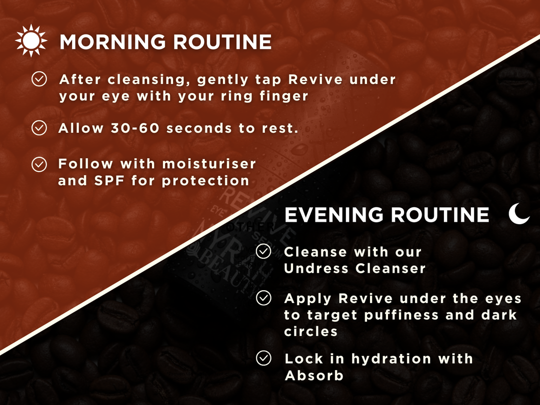 If you’ve ever slept well but still looked exhausted the next morning, Revive was made for you. A blend of caffeine, Matcha, and Niacinamide helps to visibly reduce puffiness and dark circles — giving that “I’ve actually slept” look, even when you haven’t.