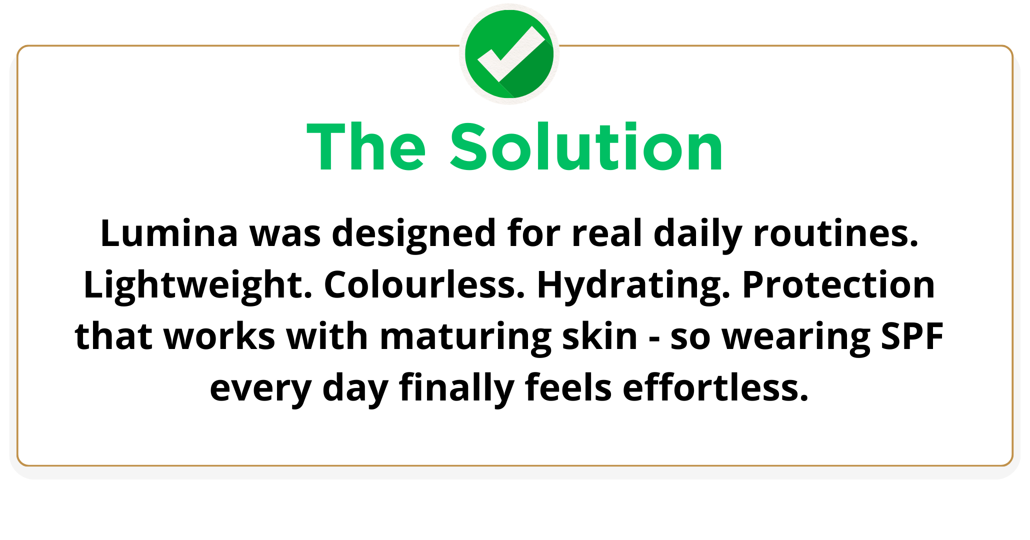 Lumina SPF50 is a completely colourless formula that blends seamlessly into the skin without leaving the traditional white cast many sunscreens do.