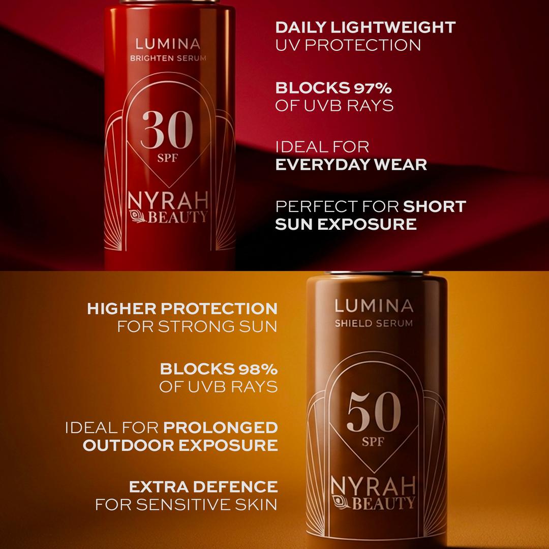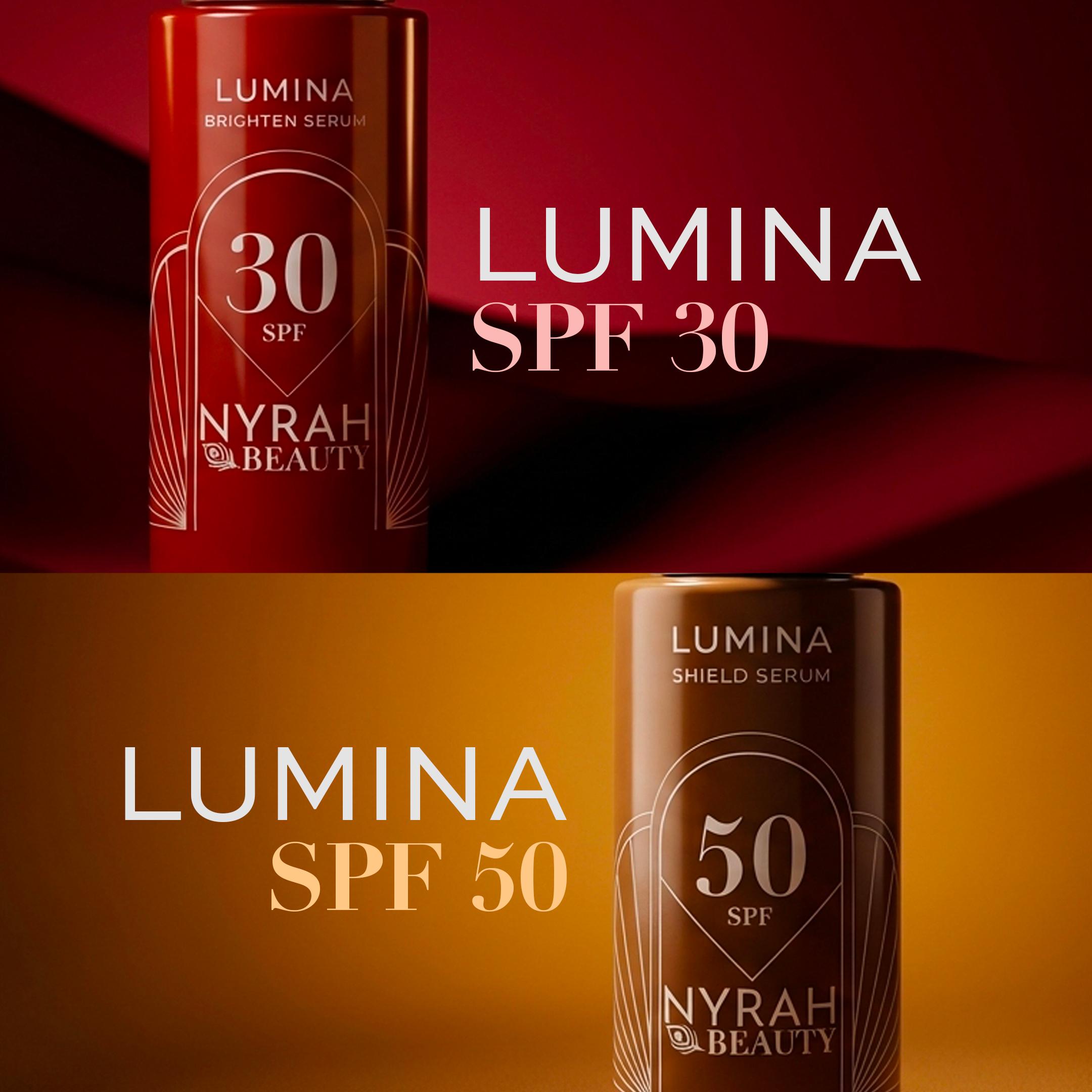 Lumina SPF30 is for brightening and light protection, Lumina SPF50+ is for full coverage sun protection.
