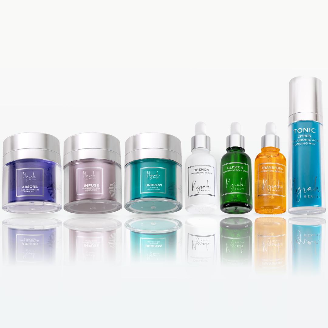 Seven full-sized Nyrah products: Undress, Drench, Glisten, Transform, Infuse, Absorb plus the Tonic Mist.